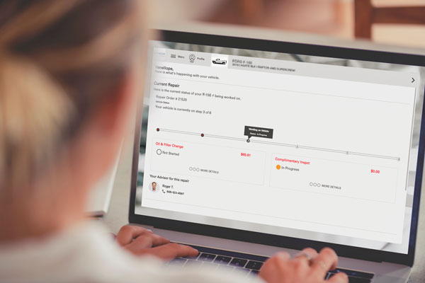 <!-- wp:reyrey-js/list-item {"content":"A customer visits your website to schedule a service appointment. She’s able to view current vehicle information, past vehicle repairs, needed maintenance, and previously declined work. With the click of a button, she selects repairs needed and schedules a service appointment."} /-->