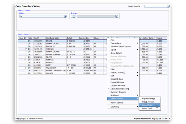 <!-- wp:reyrey-js/paragraph {"content":"\u003cspan class=\u0022RR-Font-Weight Bold\u0022\u003eStep 2:\u003c/span\u003e Compare your actual dirty core parts inventory to this report. To view the total core value for the report, right-click any column header and choose \u003cem\u003eReport Options →\u003c/em\u003e\u003cem\u003e Report Total\u003c/em\u003e. This turns on the Report Total line."} /-->